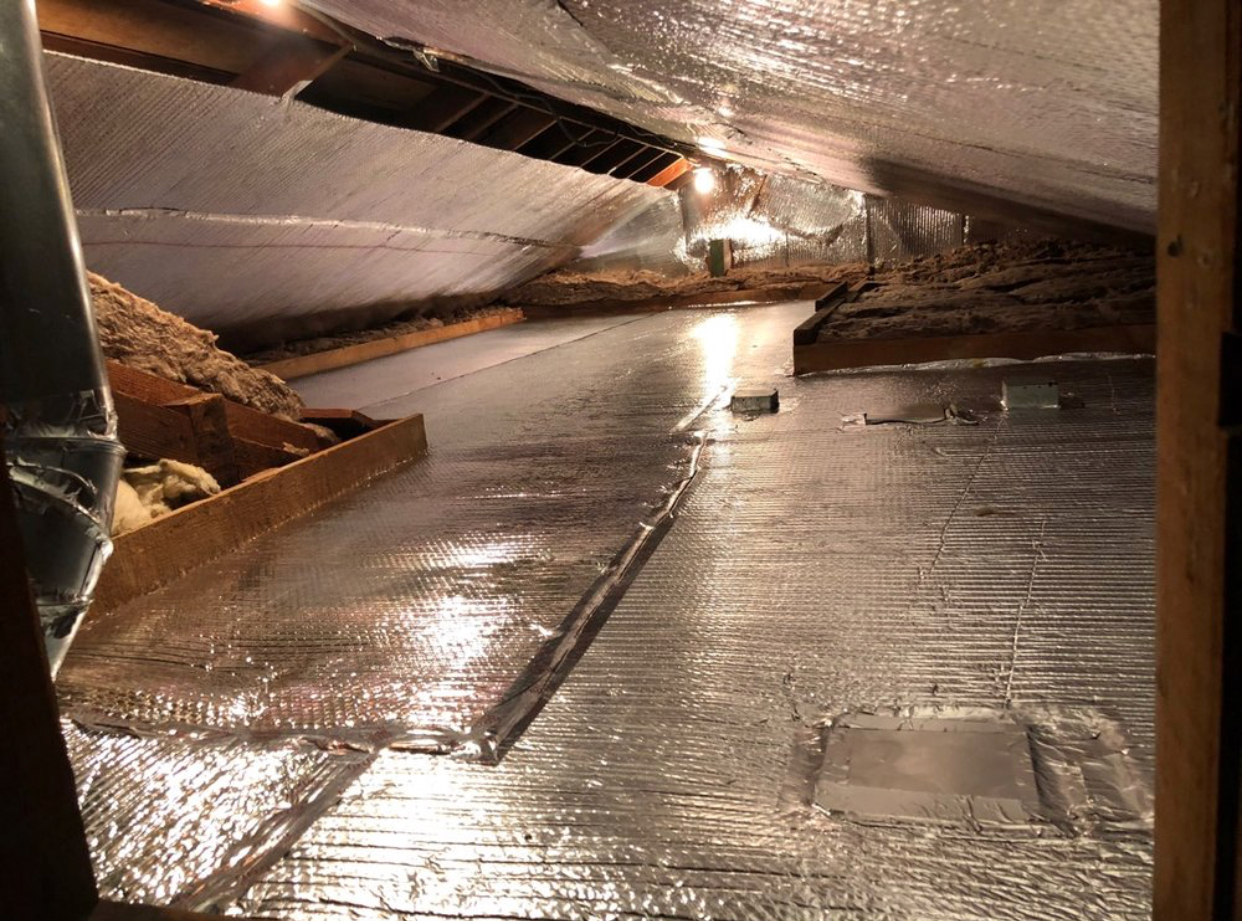 A radiant heat barrier can help trap in cold air and help avoid overspending on energy bills as a result of huge air conditioning costs. Radiant barriers work by inhibiting radiant heat gain. Radiant energy from the sun heats your roof. The energy travels through your roof assembly by conduction. The hot surface on the underside of your roof, in your attic, radiates heat onto cooler surfaces in your attic, such as your air ducts and the floor of the attic. Radiant barrier materials work to prevent the radiant energy traveling from the hot roof deck to your air ducts and attic floor. Radiant barriers are sometimes referred to as "reflective insulation" and "radiant barrier insulation" because, similar to insulation, they can effectively slow the transfer of heat. In an attic, the radiant barriers we use work by reflecting heat. When it's hot, up to 97% of a radiant barrier can reflect the sun’s heat back outside. This will reduce the heat gain and take a load off of your air conditioning. In the winter, this “reflective effect” works the other way, reflecting heat from the house back toward your living space.